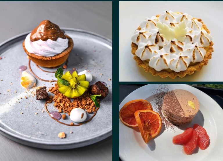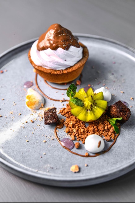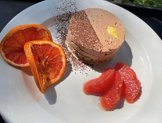 Grapefruit chocolate mousse tart filled with lemon curd and a chocolate sponge base with segmented grapefruit and  a grapefruit tuile.