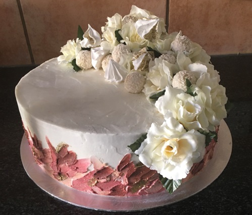 Three layered carrot cake filled with a decadent cream cheese filling with freshly baked meringues and Raffaello truffles and fake flowers.