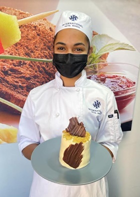vanilla sponge cake filled white chocolate mousse covered in a strawberry sponge topped with a strawberry jelly.