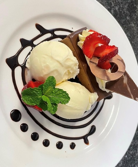 chocolate mousse with a brownie base topped with melted chocolate and vanilla ice cream.