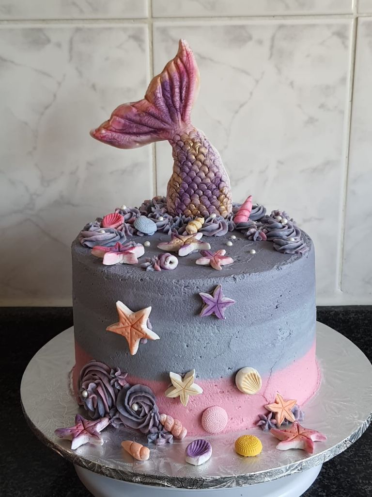 vanilla sponge cake with vanilla butter cream frosting and hand sculptured mermaid tail and shell decor.