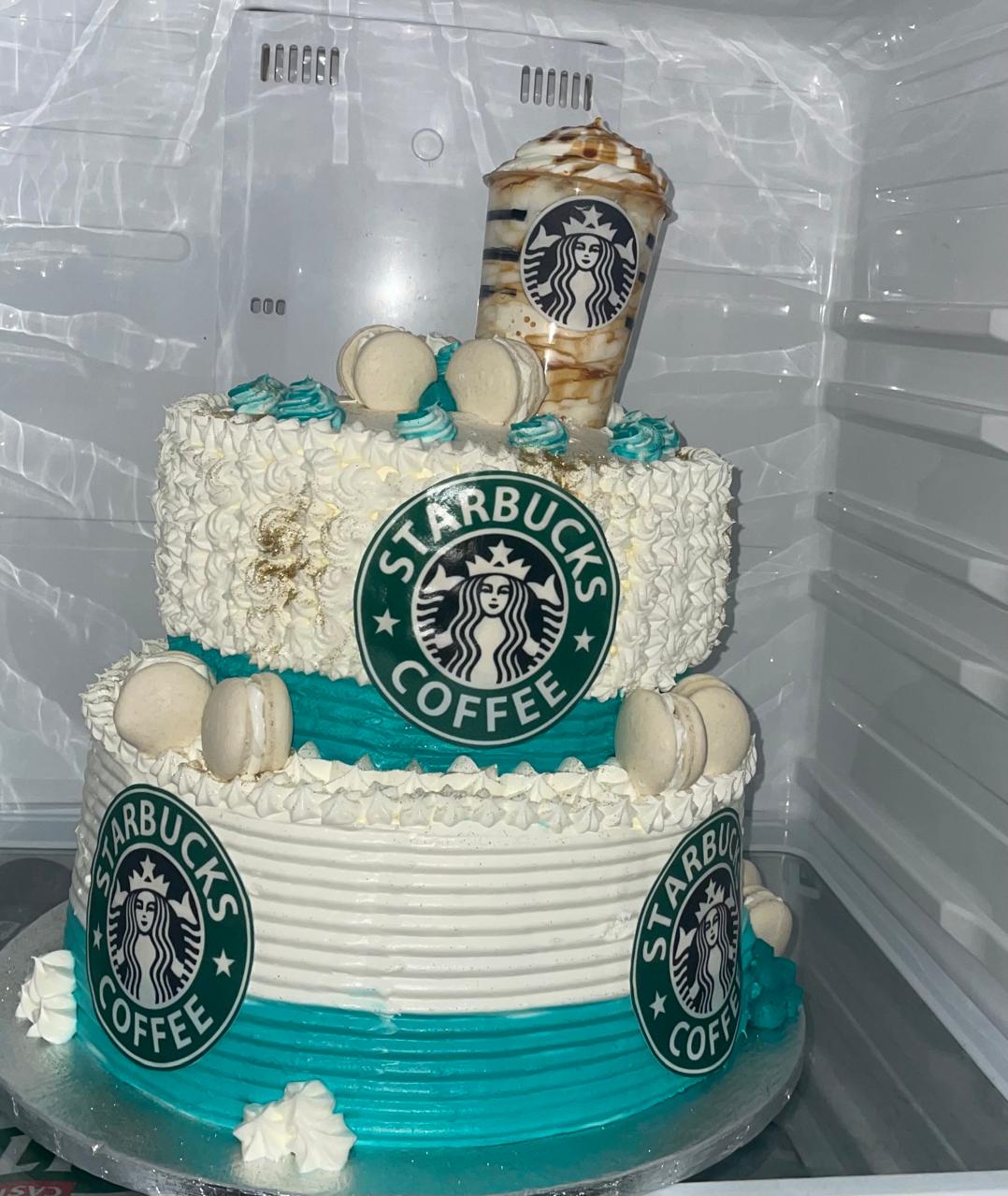 milk chocolate mousse Starbucks themed cake with freshly baked macarons.
