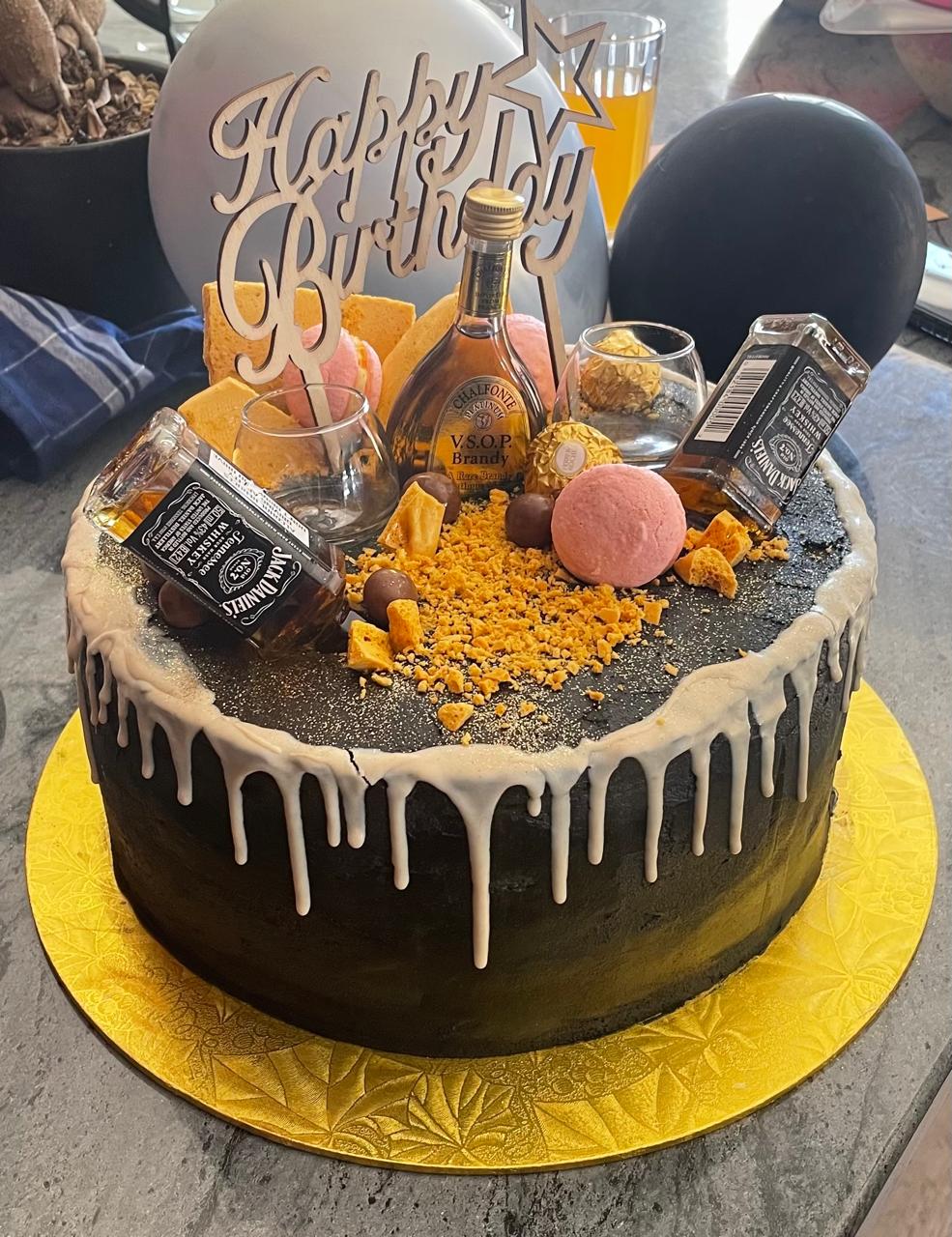 chocolate sponge cake filled with buttercream and topped with homemade honeycomb and macarons.